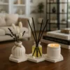 El işçiliği ile üretilmiş premium taş tozu 3’lü alt sunumluk set, modern tasarımlı dekoratif vazo ve 2 adet şamdanlık ile yaşam alanınıza şıklık ve sıcaklık katın.
