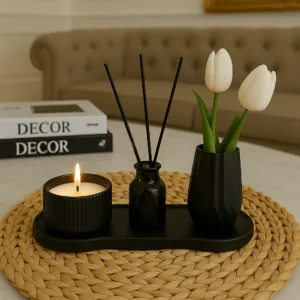 Evinize hem görsel hem de kokusal bir şıklık katacak 4’lü Dekoratif Set, modern tasarımıyla her ortama uyum sağlar. Taş tozundan üretilmiş zarif sunum altlığı üzerinde, kapaklı dekoratif kokulu mum, tazeleyici oda kokusu ve minimalist tasarımlı vazo bir araya gelir. Misafirlerinize hoş bir ambiyans sunmak, özel günlerde romantik bir atmosfer oluşturmak ya da günlük yaşamda huzurlu bir ortam yaratmak için idealdir. Hem dekoratif hem de işlevsel tasarımıyla evinizin her köşesine değer katar.
