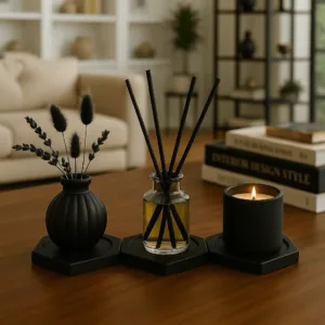 🕯 Set İçeriği: 3 alt sunumluk, 1 dekoratif vazo, 1 kokulu mum, 1 oda kokusu