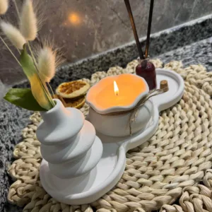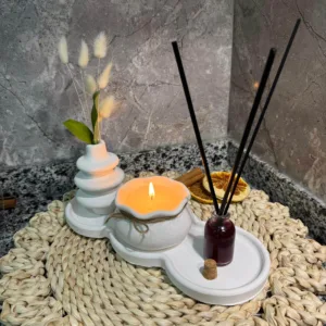 El işçiliğiyle hazırlanmış bu özel set, yaşam alanınıza şıklık ve huzur katmak için tasarlandı. Set içerisinde 1 adet modern formda vazo, 1 adet dekoratif kavanozda mum, 1 adet şık oda kokusu ve 1 adet taş tozu altlık sunum tabağı yer alıyor. Hem görsel olarak estetik hem de işlevsel olan bu kombin, evinizin her köşesinde göz alıcı bir dekor oluşturur. Sevdiklerinize hediye olarak da mükemmel bir tercihtir.